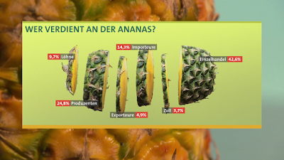 Figura sobre desglose porcentual sobre repartición de las ganancias de la piña exportada desde Costa Rica a Alemania, extraído del reportaje de la SWR titulado “Billige Ananas auf Kosten der Plantagen-Arbeiter”, disponible aquí